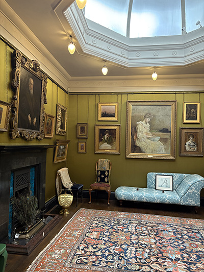 The home’s stunning center is called Arab Hall, a vibrant, turquoise room covered in medieval tiles from Damascus although the original inspiration was a 12th-century Sicilian palace room. Leighton’s friends and fellow artists working on his interior included the potter William DeMorgan and artist-illustrator Randolph Caldecott. This cross-pollination of friends and cultures is an idea that has fueled my own writing so I felt at home as I slowly toured the grand residence, which also features an addition holding modern art from the Near East and North Africa donated or loaned recently. In the original house rooms we can admire paintings by Leighton and his friends, who included John Singer Sargent, John Everett Millais and Lawrence Alma-Tadema.