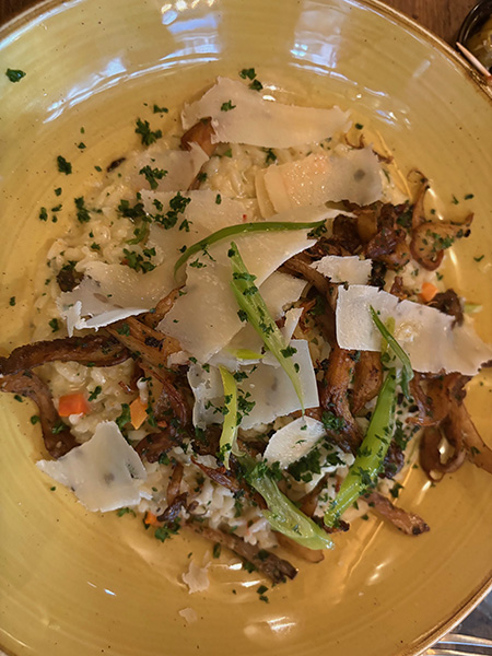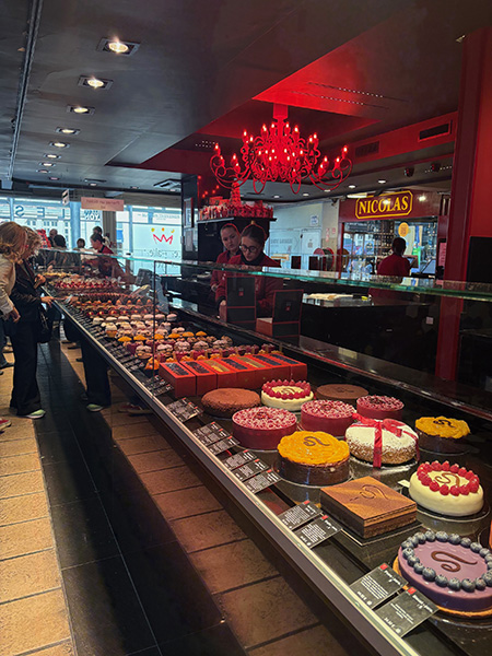 I tried out my fractured French phrases at a real café where the café crème was hot and strong, and the accompanying croissant smaller than what I was used to in America, and also much more tender and flavorful. Lyon is considered France’s culinary capital, and I explored this through restaurants near where I was staying, and also in central Lyon at Les Halles de Lyon Paul Bocuse, a covered grocery and restaurant market named in honor of the late godfather of nouvelle cuisine. There are many kinds of food in Lyon, all seeming delicious. My highlights included a pork medallion with lentils at the food hall, and a very fine mushroom risotto and a salad Lyonaisse at a perfect little cafe called Le Layon. Another intriguing detail is Lyon’s tradition of almond-flavored cakes that are always colored fuchsia.